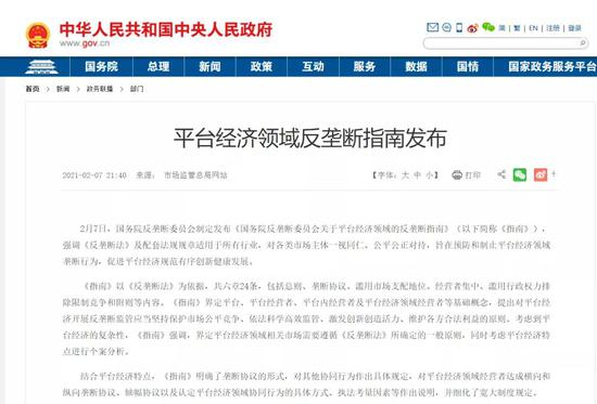 平台经济领域的反垄断指南》已正式发布