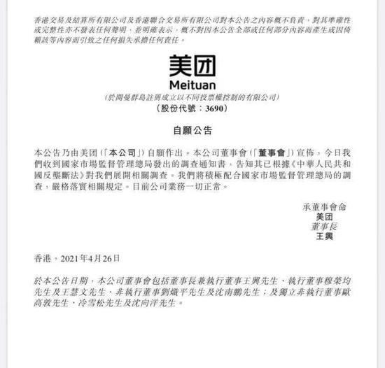 26日晚间,美团在港交所发布公告称,今日我们收到国家市场监督管理总局发出的调查通知书,告知其已根据《中华人民共和国反垄断法》对我们展开相关调查。我们将积极配合国家市场监督管理总局的调查,严格落实相关规定。目前公司业务一切正常。