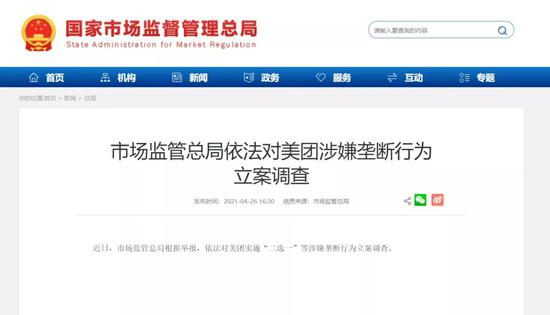 据市场监管总局官网26日消息,近日,市场监管总局根据举报,依法对美团实施“二选一”等涉嫌垄断行为立案调查。
