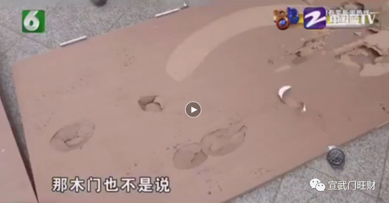 “没想到,门竟然都是‘纸板门’,一脚踹出一个坑。”为证明所言不假,业主对拆下来的两扇门做了一个实验。