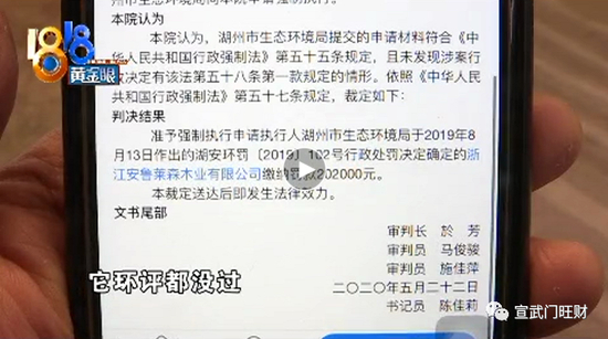 业主们察觉到,浙江安鲁莱森木业有限公司曾经受到湖州生态环境局的处罚,还因为对方迟迟不交罚款,被申请法院强制执行过。