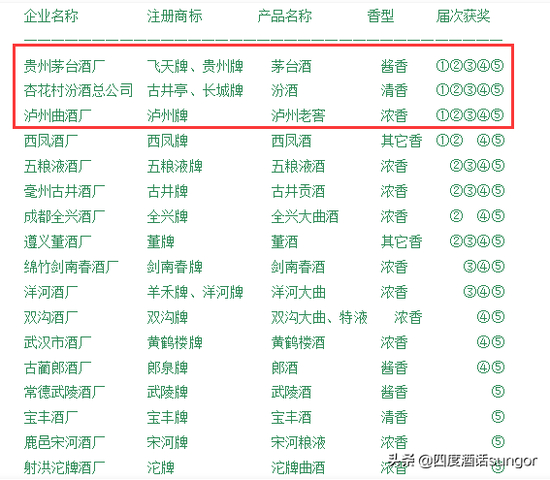 泸州老窖分别于1952年,1963年,1978年,1983年,1989年连续5届获得了全国评酒会的“中国名酒”称号。这份荣耀也只有“三大基本香型”浓清酱的开创者(泸州老窖、汾酒、茅台)拥有。
