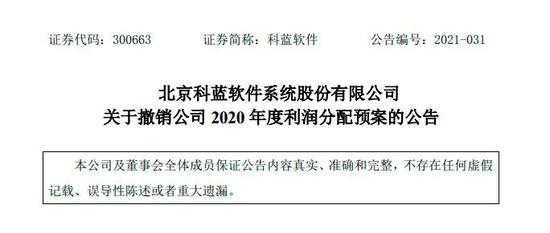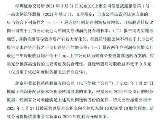 具体来看,27日上午开盘前,科蓝软件发布公告称,经测算,公司未能满足深交所关于高比例送转股份的部分条件,因此决定撤销2020年年报披露的“10转10股”预案。