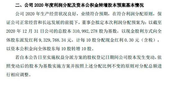 记者注意到,公司年报利润分配预案是26日晚间刚刚披露的。该方案具体内容为:以截至 2020 年 12 月 31 日公司的总股本3.11亿股为基数,以现金股利方式向全体股东每10股分配现金红利0.30元(含税),以资本公积金向全体股东每10股转增10股。