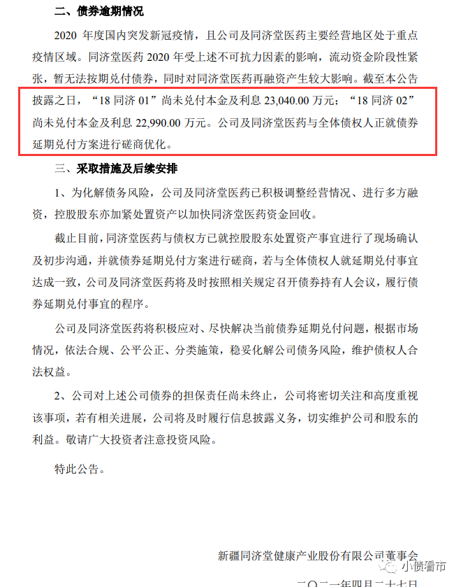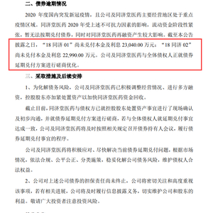 截至目前,“18同济01”尚未兑付本金及利息2.3亿元;“18同济02”尚未兑付本金及利息2.299亿元。