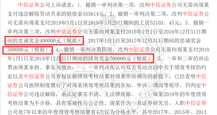 中信证券员工年度考核不合格遭调岗、解雇 法院判公司赔偿180多万