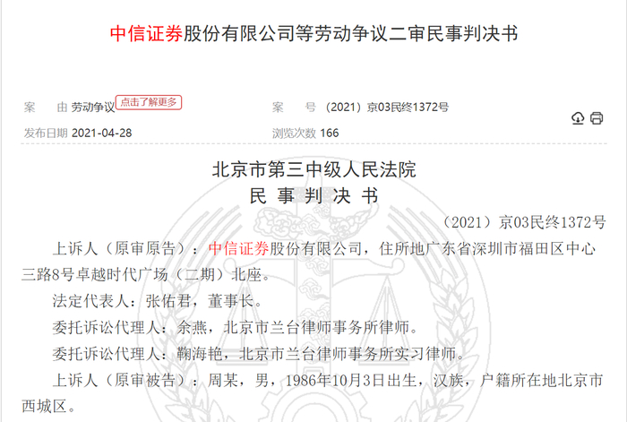 4月28日,据中国裁判文书网官网披露的一则中信证券的劳动争议二审判决书显示,周某于2012年5月2日入职中信证券公司,工资标准为55000元/月,双方劳动关系于2019年3月29日解除。