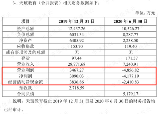 令人费解的是,天琥教育在完成2017至2019年的业绩承诺后,在2020年上半年业绩大变脸。该收购公告显示天琥教育在2020年上半年营业利润亏损4857万元、净利润亏损4177万元,经营性现金流也大幅净流出。