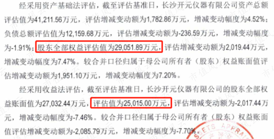 评估报告显示,资产基础法评估开元有限的总资产为4.12亿元,净资产评估值2.91亿元,较账面净资产仅仅是溢价7.47%。而收益法评估,账面净资产2.70亿元(与上表数据有出入)的评估值为2.50亿元,折价7.46%。