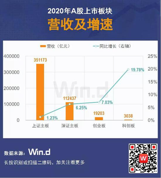 2020年各板块的业绩增长出现分化。科创板公司表现尤为亮眼。营收增速达19.78%,位居各板块首位。
