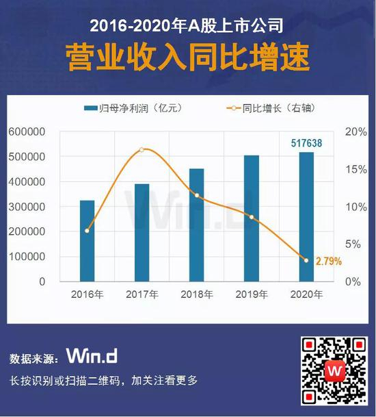 2020年A股上市公司合计实现营业总收入51.76万亿元,同比增长2.79%,营收持续增长。
