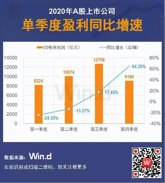 分季度看,今年以来A股整体业绩持续复苏。2020年第四季度,A股整体净利润增速为64.35%,明显要好于第三季度17.45%。