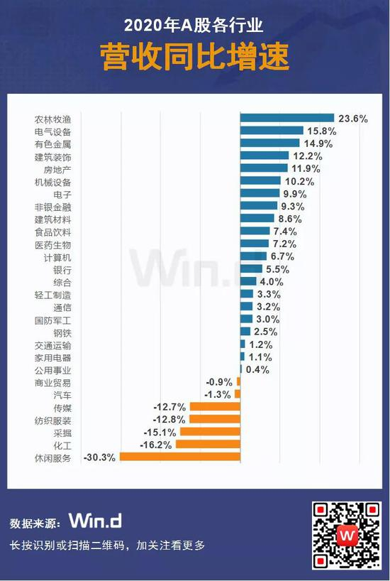 2020年营业收入呈现增长的有农林牧渔、电气设备、有色金属、建筑装饰、房地产等21个行业,占比超过70%。