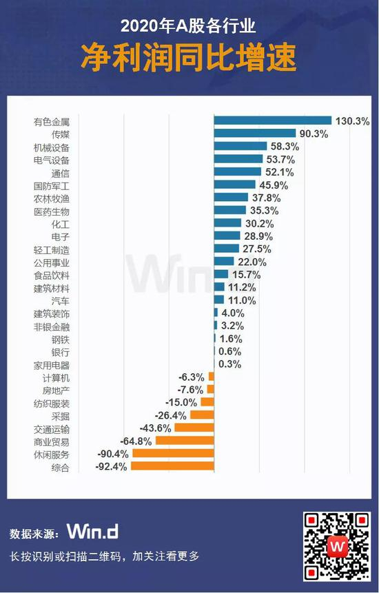 2020年,受益于大宗商品价格上涨,有色金属行业净利润增长最为明显,同比增速达130%,传媒、机械设备、电气设备、通信等行业净利润增速亦较高。此外,因疫情影响,综合、休闲服务净利润下滑均超过90%。