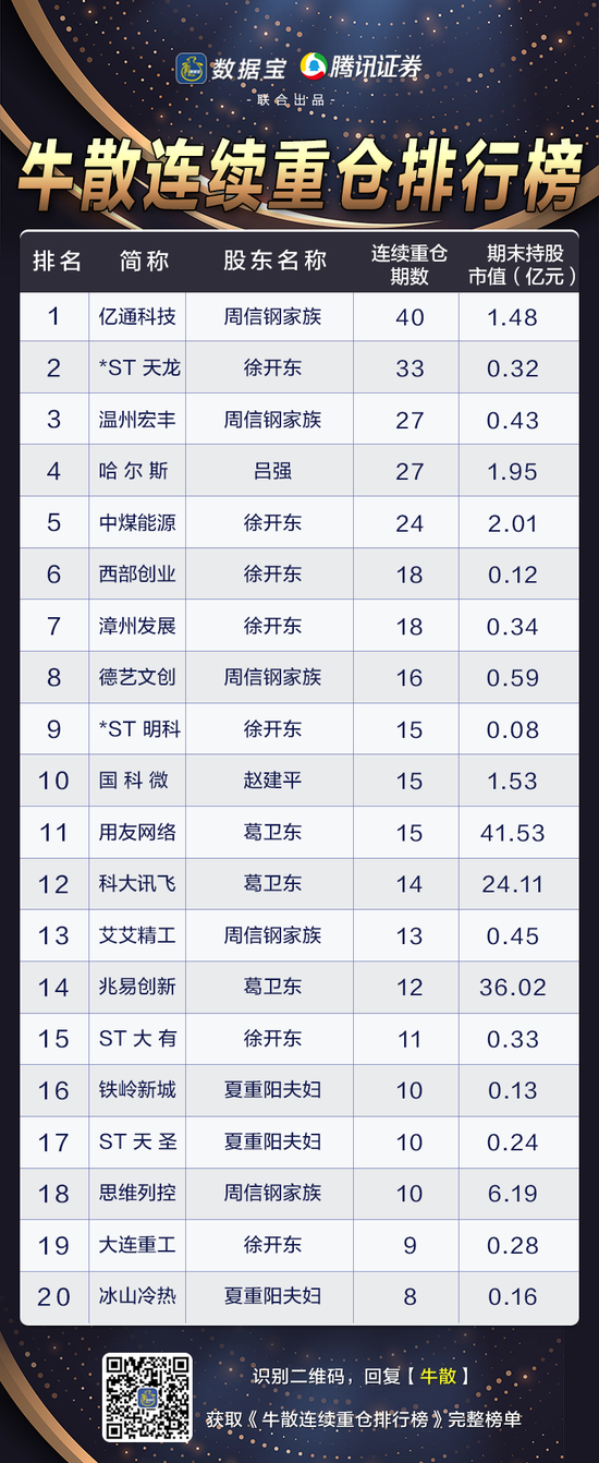 不仅仅是葛卫东,长期持股在部分牛散中也得到践行。数据宝统计显示,在十大牛散重仓股中,已经有39只持仓在1年以上,占比接近一半;14股持仓在3年以上。其中,有着香水大王之称的周信钢家族,连续重仓亿通科技40个报告期,位居首位。同样热衷题材的徐开东,则连续重仓*ST天龙27个报告期。另外,周信钢家族重仓温州宏丰、吕强重仓哈尔斯、徐开东重仓中煤能源等,均已重仓24个报告期以上。