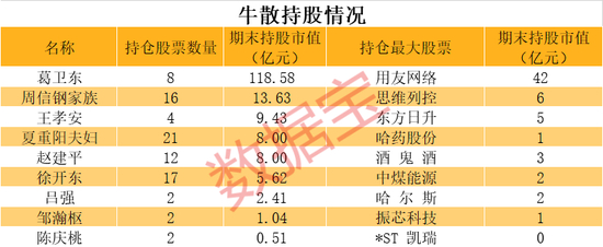 在A股历史上,知名牛散众多。数据宝整理出的知名牛散,包括陈庆桃、葛卫东、周信钢家族(周信钢、周晨、李欣)、夏重阳夫妇(张素芬、夏重阳)等,通过他们的持股窥见其持仓特征(同一名称视作同一人)。