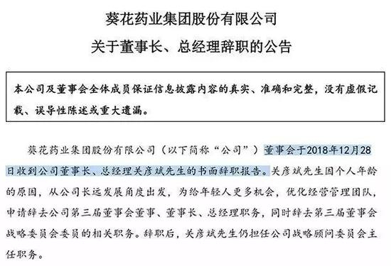 而在张晓兰全面退出公司一年多以后,葵花药业又于2019年1月1日晚间发布公告,称葵花药业董事会于2018年12月28日收到公司董事长、总经理关彦斌的书面辞职报告,其因个人年龄原因申请辞去董事、董事长、总经理职务,理由是“从公司长远发展角度出发,为给年轻人更多机会,优化经营管理团队”。