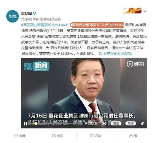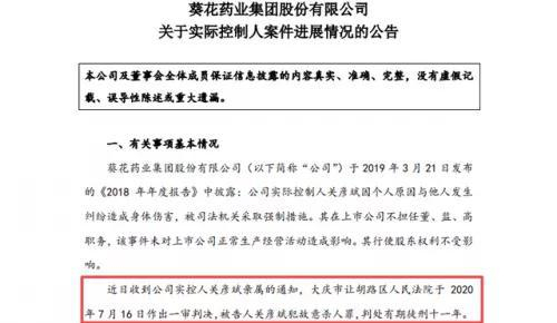 2020年7月17日午间,葵花药业在深交所发布公告称,法院于7月16日作出一审判决,公司实控人关彦斌因犯故意杀人罪,被判处有期徒刑十一年。