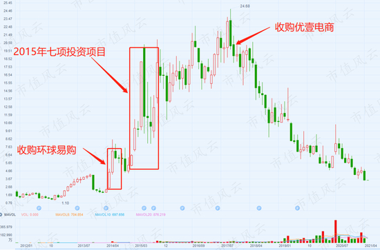 2014年7月,公司发布重大资产重组预案,向徐佳东、李鹏臻、深创投、红土创投等收购环球易购全部股权,作价10.32亿,增值率高达13.25倍。
