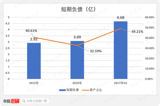 另外,有一个非常明显的问题是,优壹电商的短期负债非常高,2015年至2017年H1的短期负债占总资产比例分别高达40.61%、32.59%和49.21%。