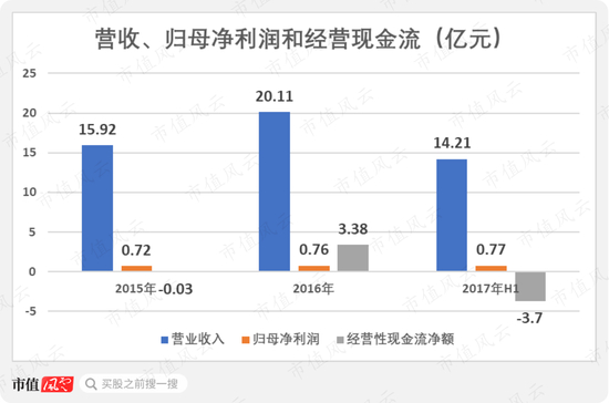 但是经营性现金流净额飘忽不定,2015年净卖出300多万,2016年突然净流入达3.38亿,远高于同期归母净利润,而2017年H1又大幅净流出3.7亿。