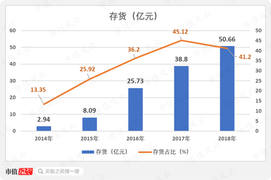 跨境通的存货从2014年的2.94亿飙升至2018年的50.66亿,占总资产比例从13.35%上升至2017年的45.12%。
