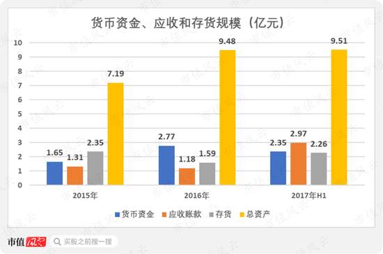 从资产端看,与一般跨境电商公司相似,资产主要由货币资金、应收账款和存货为主,2017年H1这3项资产合计达7.58亿,资产占比多达8成。
