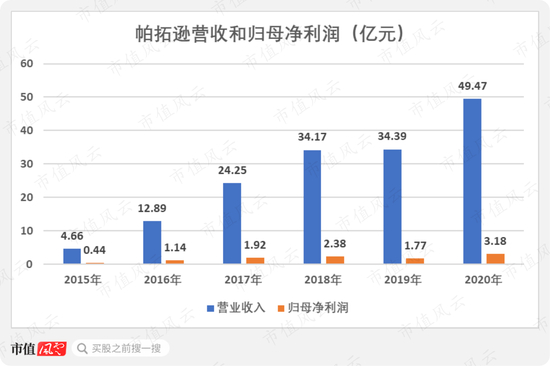 帕拓逊的营收增长速度较快,从2015年的4.66亿增长至2020年的49.47亿,复合增速多达60.4%。