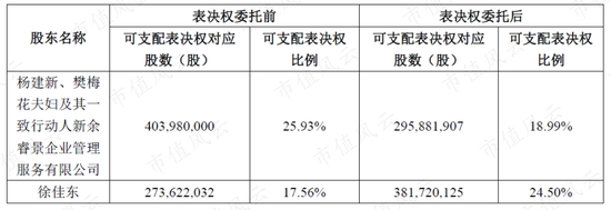 9月21日,双方明确了转让事项,杨建新把6.94%股权的表决权委托给徐佳东,双方没有金钱上交易,委托后,徐佳东的表决权上升至24.5%,杨建新夫妇的表决权下降至18.99%。