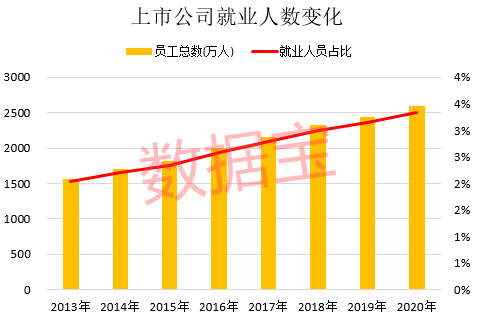 数据宝发布的《A股员工榜》显示,2020年A股上市公司员工人数逼近2600万,首次超过上海市总人口,对拉动就业效果日益显著,员工总数占全国就业人口比例创历史新高,沿海发达地区活力十足,贡献了最多的新增就业人口。