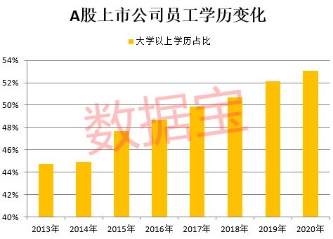 上市公司员工门槛近年来一直呈现上升态势。2020年A股上市公司员工中,大学(指大专及以上)学历人数占比上升至53%,创历史最高水平。5月11日发布的全国人口普查数据显示,全国拥有大学(指大专及以上)文化程度的人口为2.18亿人,大学文化程度占比为15.47%。对比来看,上市公司员工学历大幅超出全国水平,大学生人数占比是全国的3.43倍。