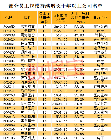 上市公司员工规模持续增长,一定程度上可以体现公司经营效益持续提升。与历年数据对比来看,有75家公司员工数量连续增长十年以上,入围公司中来自医药生物、电子、计算机行业的数量最多,这三大行业正是新兴产业最为集中的行业,包括安防龙头海康威视、创新药龙头恒瑞医药、疫苗龙头智飞生物、消费电子龙头立讯精密等均在其中。