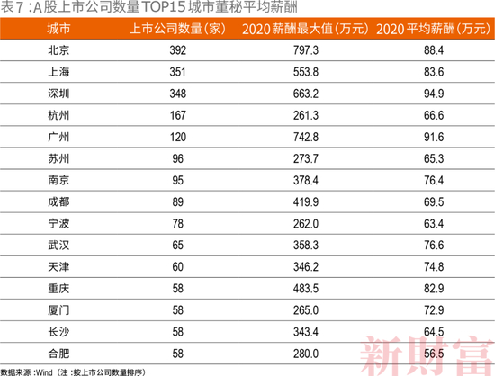 在北上广深一线城市中,上海董秘的平均薪酬最低(表7)。