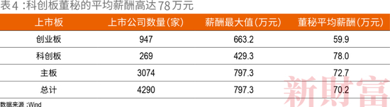 自2019年7月22日科创板上市交易,截至2021年5月5日,科创板上市公司已达到269家。这269家公司董秘的平均薪酬高达78万元,高于主板上市公司董秘平均薪酬的72.7万元,高出创业板董秘近20万元(表4)。