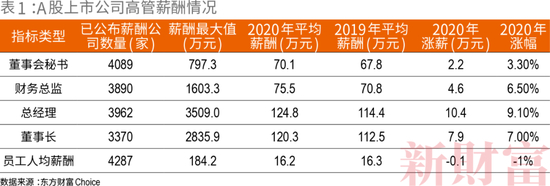同期,A股上市公司总经理的平均年薪为124.8万元,平均涨薪10.4万元,涨薪幅度最大。薪酬最高的为安迪苏(600299)的总经理Jean Marc Dublanc,其2020年的薪酬达到3509万元,日入近10万元。