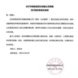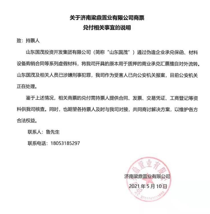 说明表示,山东国茂投资开发集团有限公司(简称“山东国茂”)涉嫌刑事犯罪,梁鼎置业作为受害人已向公安机关报案。鉴于此,“期望各持票人及时与我司对接,共同商讨解决方案,以维护各方合法权益。”