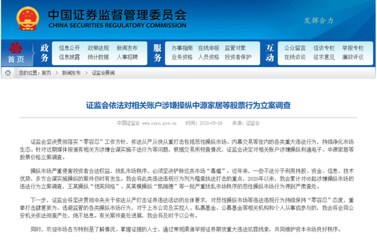 16日晚,证监会宣布针对近期媒体报道有相关方涉嫌合谋实施不法行为等问题,根据交易所核查情况,证监会决定对相关账户涉嫌操纵利通电子、中源家居等股票价格立案调查。