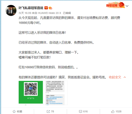 得到证监会“支持”的叶飞在微博上更加洋洋得意,气势越发“嚣张”。叶飞甚至在微博表示,“从今天现在起,凡是要采访我的新的媒体,请支付出场费和采访费,顾问费16666元每小时。这样可以进入采访我的媒体白名单!”