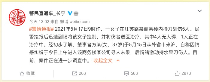 根据警方通报,5月17日早上9点左右,一名女子在分众传媒上海一办公室持水果刀划伤5人。网传视频显示,事发办公楼内到处都是血迹,还有人衣服裤子上沾满血躺在地上。接警后,民警迅速到场将该女子控制,并将伤者送医。目前4人已无大碍,1人正接受治疗。
