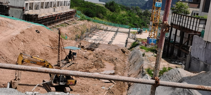 原本预计今年6月30日交房的肇庆泰禾院子,已停工1年4个月,项目工程部分停滞于一二层(总高五层),部分仍是土坑。虽然项目方宣布于4月底开始复工,但是该项目业主于5月9日施工现场拍到的照片中可见,土坑上摆放着老式的打桩机,仅有几个工人在作业。