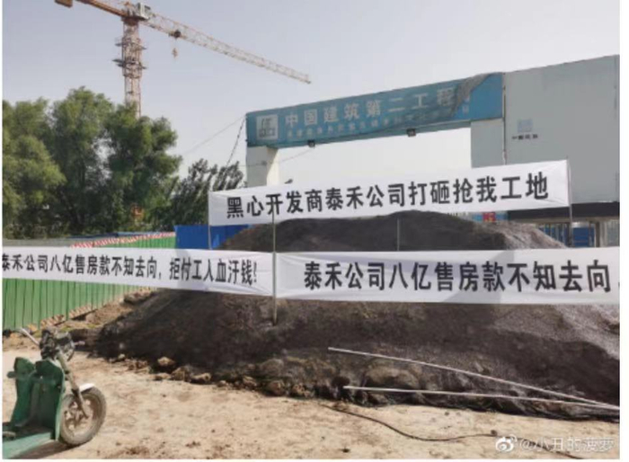 “2018年买房时项目已封顶,但从2019年开始停工至今,项目外观就没有实质性变化。”郑州中州院子业主徐女士表示,项目交房日期从2020年10月底推迟至今年6月底,但近期工地工人拉出了“泰禾公司8亿售房款不知去向,拒付工人血汗钱”的横幅,让其感到交房更加无望。