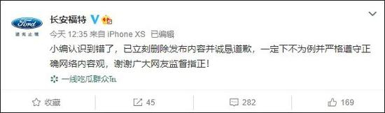 18日中午,长安福特官方微博“@长安福特 ”发布道歉声明称,“已立刻删除发布内容并诚恳道歉,一定下不为例并严格遵守正确网络内容观,谢谢广大网友监督指正!”