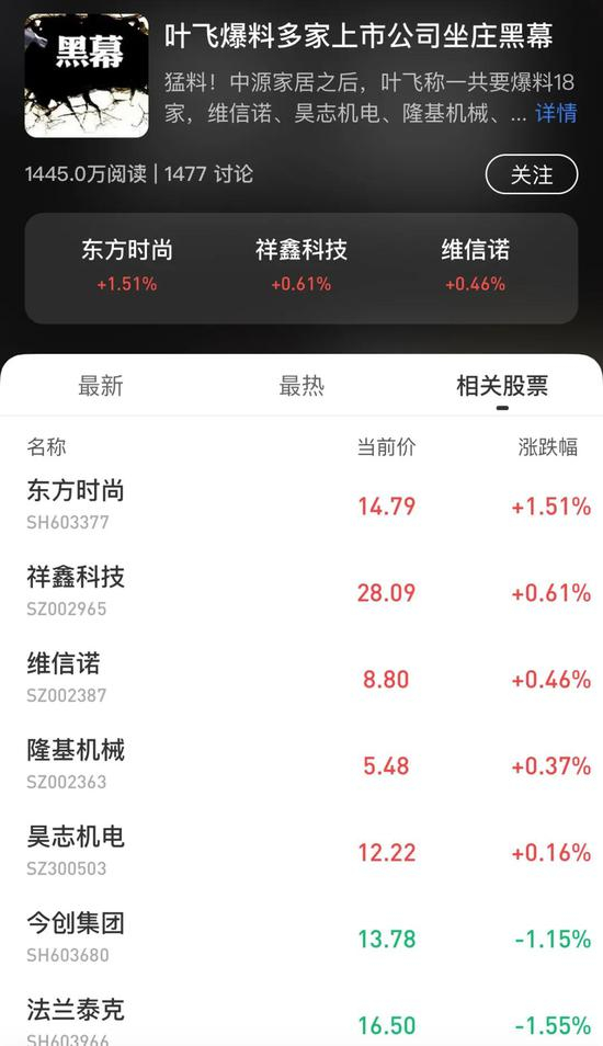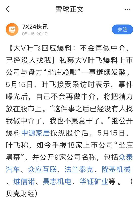 继爆料中源家居涉嫌操纵股价之后,5月14日中午时分,充满争议的私募大佬叶飞发布微博称,“计划爆料18家上市公司”,其相继点名了ST华钰(601020.SH)、东方时尚(603377.SH)、维信诺(002387.SZ)、昊志机电(300503.SZ)、隆基机械(002363.SZ)等A股上市公司。
