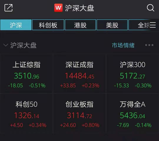 据Wind数据,截至收盘,上证指数跌0.51%,报3510.96点;深证成指涨0.23%,报14484.45点;创业板指涨0.80%,报3114.72点。