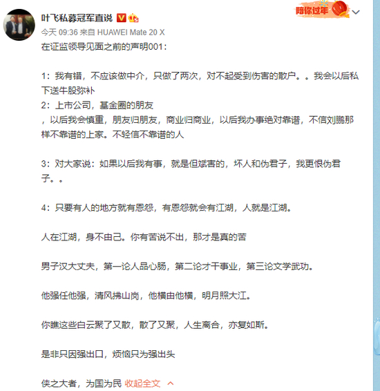 同时,叶飞表示:我现在开始,要守口如瓶。不再谈论相关敏感内容。