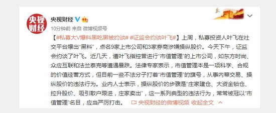 据央视财经消息,上周,私募投资人叶飞在社交平台爆出“黑料”,点名9家上市公司和3家券商涉嫌操纵股价。今天下午,证监会约谈了叶飞。