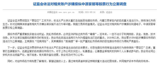 5月14日晚,证监会发文表示,派出机构已约谈公司及相关各方,并启动核查程序,将一查到底、依法严惩,并及时向社会公布。5月16日,证监会官网发布消息表示,针对近期媒体报道有相关方涉嫌合谋实施不法行为等问题,根据交易所核查情况,证监会决定对相关账户涉嫌操纵利通电子、中源家居等股票价格立案调查。