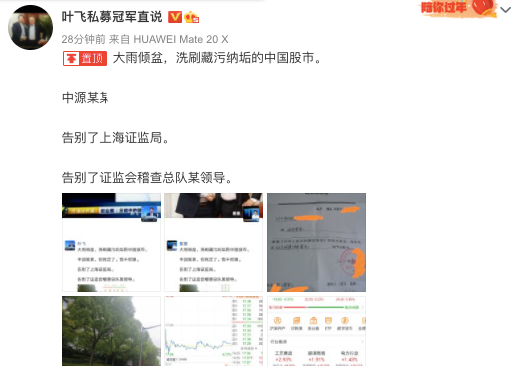 下午5时,叶飞在微博发文称,告别了上海证监局与证监会稽查总队某领导,还附上了调查通知书与中源家居的股票信息。关于与证监会的谈话内容,叶飞没有透露任何信息。