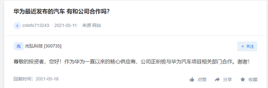 5月18日,光弘科技表示,作为华为一直以来的核心供应商,公司正积极与华为汽车项目相关部门合作。