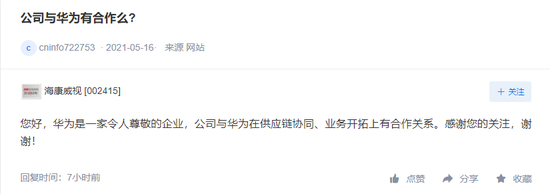 5月19日,海康威视表示,公司与华为在供应链协同、业务开拓上有合作关系。